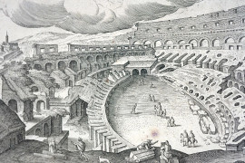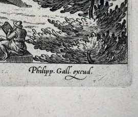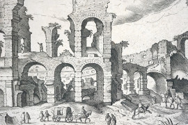 Sei antiche incisioni raffiguranti le Terme di Diocleziano, il Tempio della Fortuna, il Colosseo, Villa Adriana ed il Palatino, recanti iscrizione a destra "Philipp. Gall. excud.", cm 27x32,5, (difetti).