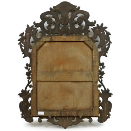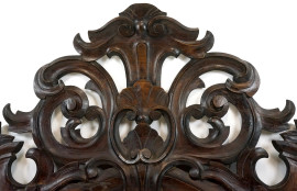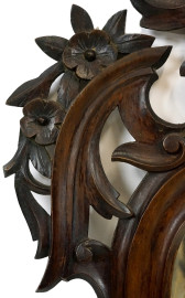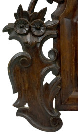 Specchiera Luigi Filippo, di linea sagomata in legno scolpito ed intagliato a volute e controvolute, fiori e foglie, cm h 125x92, (difetti)