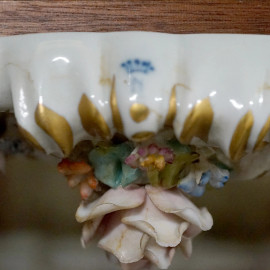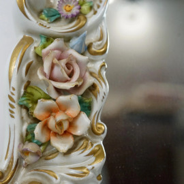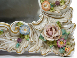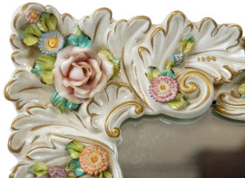 Specchiera rettangolare in porcellana Capodimonte con applicazioni floreali policrome e lumeggiature dorate, misure ingombro cm 63x49,5, misure luce cm 49,5x36, marcata, (segni del tempo).