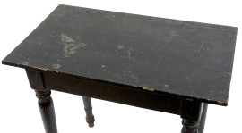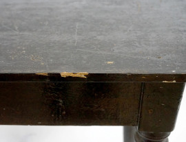 Tavolo in legno ebanizzato, XIX secolo, piano rettangolare poggiante su quattro gambe a balaustro tornito, cm 80x90x53, (difetti).