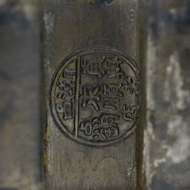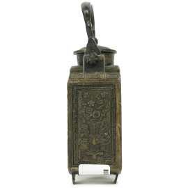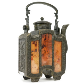 Teiera cinese, XX secolo, in metallo brunito e vetro, cm 16x14x5,5
