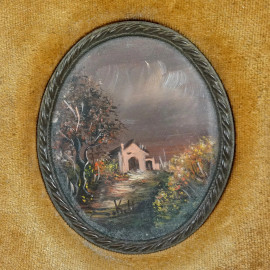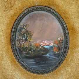 Tre miniature raffiguranti paesaggi, olio su rame, firmate, entro un'unica cornice, cm 40x11