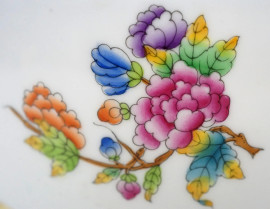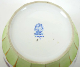 Vasetto in porcellana Herend, XX secolo, a smalto bianco con fiori e farfalle dipinti in policromia, bordi in verde, finiture dorate, cm h 15