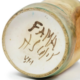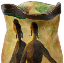 Vaso con orlo a fazzoletto in maiolica, corpo dipinto raffigurante coppia di figure, cm h 32,5, marcato FAMA Ascoli Piceno sotto la base, (difetti)