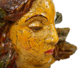 Volto di donna, scultura in terracotta smaltata policroma, cm h 15, base in legno, XX secolo.