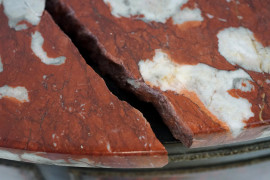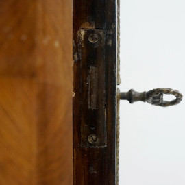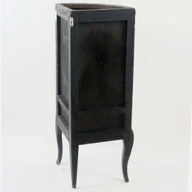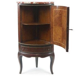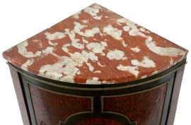 Angoliera boulle in legno ebanizzato con intarsi in metallo dorato, piano in marmo rosso, fronte ad uno sportello ed un cassetto, particolari in bronzo, due gambe mosse, cm h 100x39x44,5, (difetti, piano rotto)