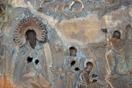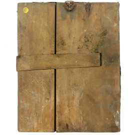 Antica icona russa con riza in metallo dorato raffigurante il profeta Elia su un carro di fuoco e scene della sua vita, cm 22x17, (difetti)
