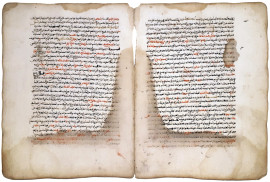 Antica rara doppia pagina manoscritta in caratteri arabi vergati a inchiostro bruno e lacca rossa, Persia, XVI secolo