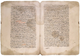Antica rara doppia pagina manoscritta in caratteri arabi vergati a inchiostro bruno e lacca rossa, Persia, XVI secolo