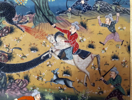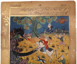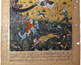 Arte islamica, antica e originale pagina miniata iraniana “Negargarè” raffigurante Scene di caccia, Iran primi dell’800, colori vegetali e oro zecchino su carta, cm 27x18, reca iscrizioni vergate a pena d’oca e inchiostro nero in lingua araba