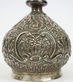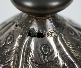 Aspersorio orientale in metallo argentato, decori incisi e sbalzati a volute e motivi floreali, cm h 35,5, (difetti)