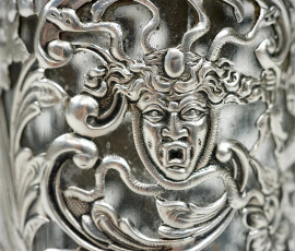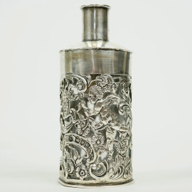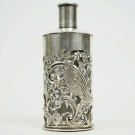 Bottiglietta porta profumo in argento e vetro, William Comyns & Sons, Londra, XIX secolo, decori raffiguranti gorgone, putto, uccelini e mascherone, cm h 12,5, (difetti, mancante coperchio)