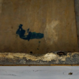 fronte a tre cassetti, gambe troncopiramidali ad obelisco rovesciato, cm h 98x135,5x58,5, (difetti).