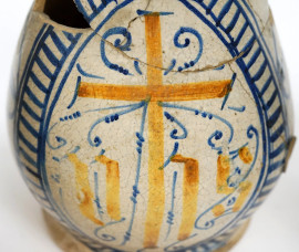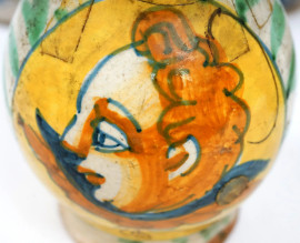 Cinque antiche brocche in ceramica con orli a fazzoletto, decori figurativi e geometrici policromi, manifattura italiana, alt. max cm 20 circa, (difetti e restauri)
