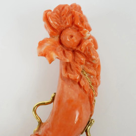 Ciondolo in corallo rosa a foggia di cornucopia, montatura in oro 18 KT, lunghezza cm 9,5, peso gr.40, (lievi difetti).