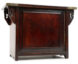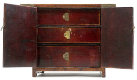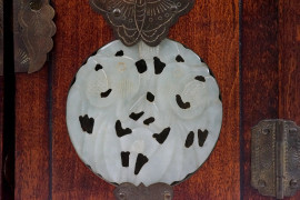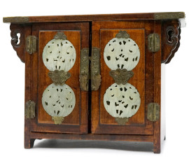 Cofanetto portagioie in legno con placchette traforate in giada, a due sportelli con tre cassettini all'interno, Cina, XX secolo, cm 20x27x15, (difetti).