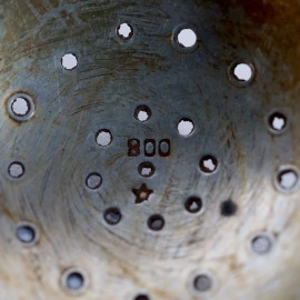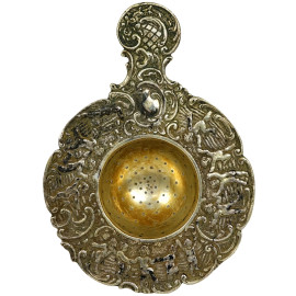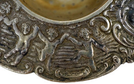 Colino in argento, inizi XX secolo, profilo di linea sagomata con decori cesellati raffiguranti danza di putti, cm 13x9,5x2, peso gr. 72