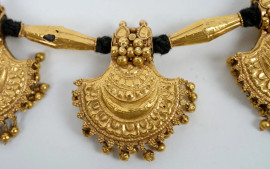 Collana etnica in cordino nero con pendenti ed applicazioni in oro 18 KT, lunghezza cm 46, (segni di utilizzo)