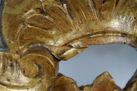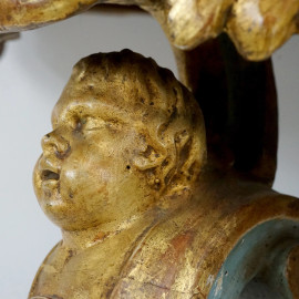 fascia intagliata a motivi fogliacei, montanti a volute con cherubini scolpiti, cm 66x82x40, (difetti e restauri).
