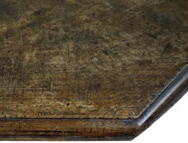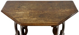 Consolle in noce, XVIII secolo, con piano trapezoidale, due montanti sagomati a lira, cm 85x121x52, (difetti).