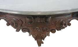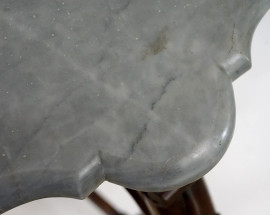 piano di linea sagomata in marmo grigio, poggiante su gambe mosse riunite da crociera, particolari intagliati a motivi di rose e riccioli.