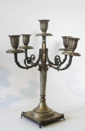 Coppia di antichi candelabri a cinque fiamme in argento 800, peso tot gr. 1450, (un braccio rotto).