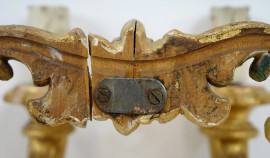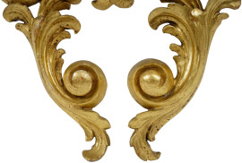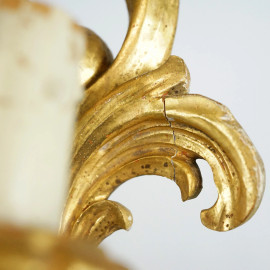 Coppia di appliques a quattro luci in legno dorato e intagliato, cm 45x25, inizi XX secolo, (difetti).