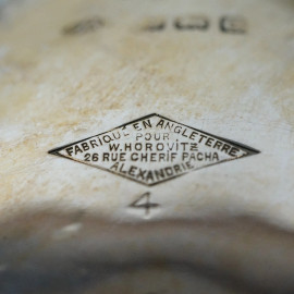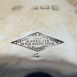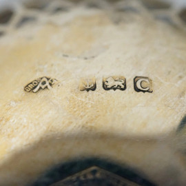 Coppia di ciotoline in argento traforato, Adie Brothers Ltd, Birmingham, XX secolo, recanti punzone "Fabriqué en Angleterre pour W. Horovitz Alexandrie", cm 4x9,5, peso gr. 90, (lievi difetti).