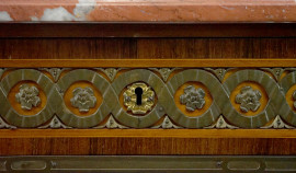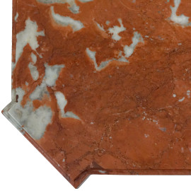 piano in marmo rosso, fronte a due cassetti decorati con medaglione di putto musicante, festoni e finiture in bronzo, gambe mosse, cm 83x98x55, (difetti).