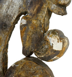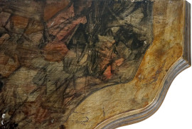 piano di linea sagomata a finto marmo, sostenuto da grande voluta arricciata, scolpita a foglie d'acanto, cm h 62,5x74x28, (difetti).
