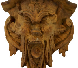 Coppia di mensoline in legno scolpito ed intagliato a mascheroni, cm 24x20x11, (difetti)