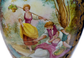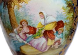corpo a balaustro decorato con riserve centrali raffiguranti scene di vita campestre; coperchio con presa a pigna e anse laterale a foggia di festoni, cm h 55, recanti firma e marca sulla base.
