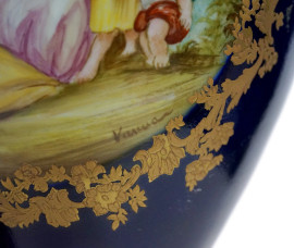 Coppia di potiches in porcellana Sèvres blu cobalto, oro con decori policromi
