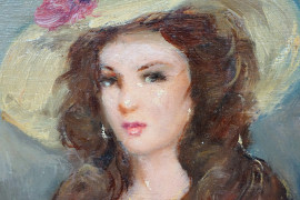 Donna con cappello, olio su compensato, cm 19x15, firmato, entro cornice.