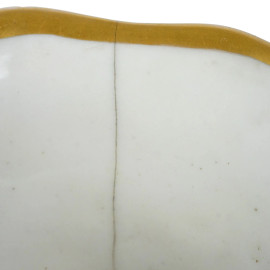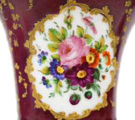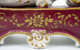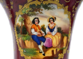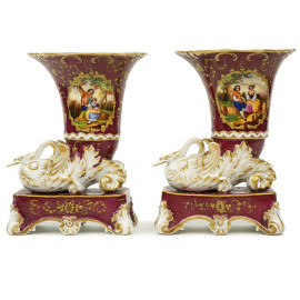 Due alzate a forma di cornucopie in porcellana bordeaux, decori policromi di scene galanti e lumeggiature dorate, basi a motivi floreali, cm 22x16x6, marcati sotto la base, XIX secolo, (filatura).