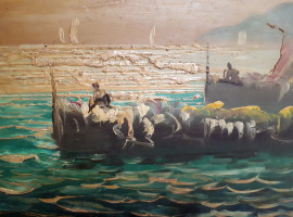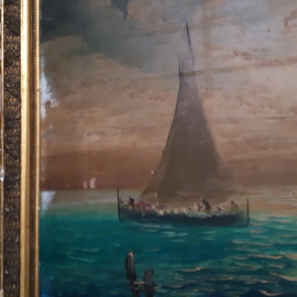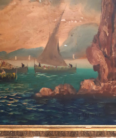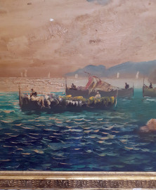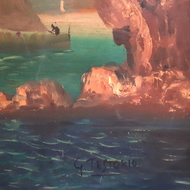 G. Testorio (1900 -?) Scorcio marino con imbarcazioni, olio su faesite, cm 45x80, firmato in basso a destra, prima metà del XX secolo, con cornice