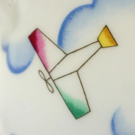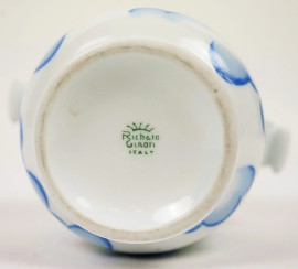 Giò Ponti per Richard Ginori, potiche in porcellana raffigurante aeropittura policroma, profili color rubino, cm h 8,5, marchio sotto la base, (lievi difetti).