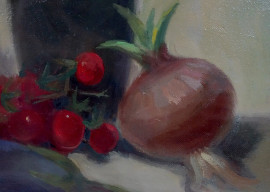 Natura morta - Verdure e vasellame, olio su tela, cm 50x60 circa, entro cornice.