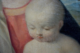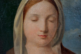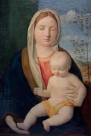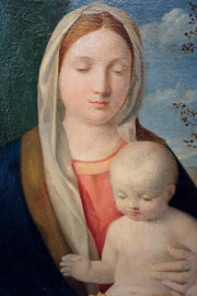 Giovanni Bellini (1430-1516) copia da, Madonna col Bambino, olio su tela, cm 48x37, entro cornice, (lievi difetti sulla tela).