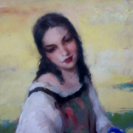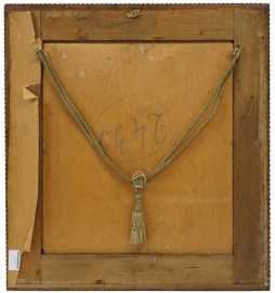Il riposo, olio su legno, cm 60,5x55, entro cornice.
