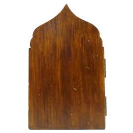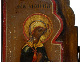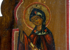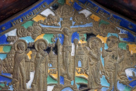 Icona da viaggio, Russia, XIX secolo, pannello centrale in bronzo e smalti policromi con formelle raffiguranti scene mariane, pannelli laterali dipinti raffiguranti Sante, cm h 19x11,5, 5,5, (difetti).