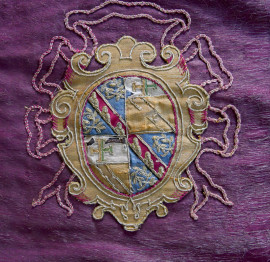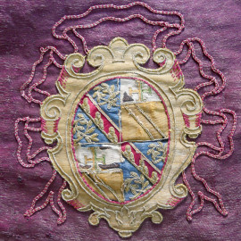 Importante paramento sacro di antica fattura, ricamato in filamenti preziosi , con stemmi Papali, cm 140 x 140 circa