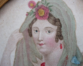 La bella parigina, stampa acquarellata, cm 12x10, fine XIX secolo, entro cornice