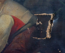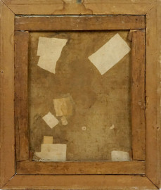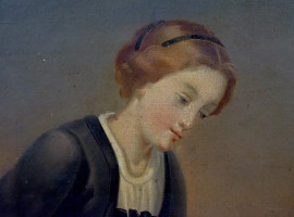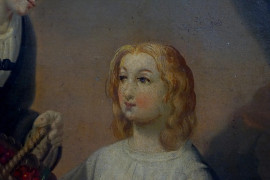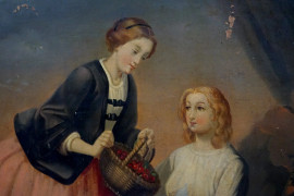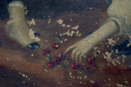 La raccolta delle ciliegie, olio su tela, cm 77x63, inizi XX secolo, entro cornice, (cadute di colore, danni da urto)