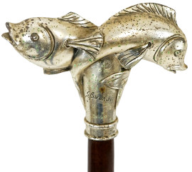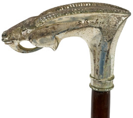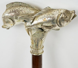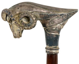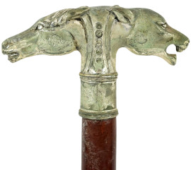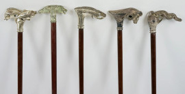 Lotto di cinque bastoni in legno con presa zoomorfe in metallo argentato, lunghezza cm 91, XX secolo, (difetti).