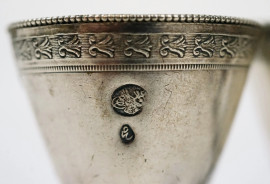 Lotto di cinque portauovo in argento, Turchia, inizi XX secolo, decori incisi e cesellati, cm h 6, peso gr.240, (difetti),
