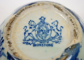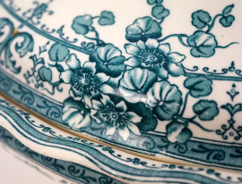 Lotto di due vasetti con profili traforati ed una legumiera in maiolica inglese, decori di fiori e paesaggi, misure max cm 13x30x18, marchi sotto la base.