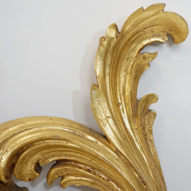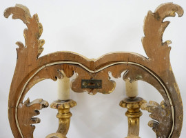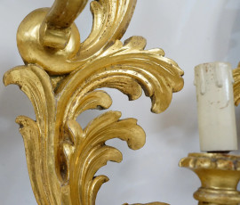 Lotto di quattro appliques a sei luci in legno intagliato e dorato, cm 66x40, inizi XX secolo.