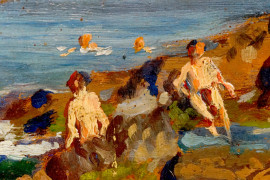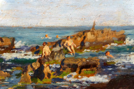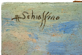 Marina ligure con bagnanti, olio su tavola, cm 19x26,5, firmato A. Schiaffino, (lievi difetti).