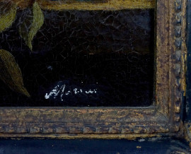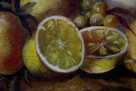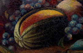 Natura morta con brocca e frutti, olio su tela, cm 40x50 , firmato Morini, entro cornice.